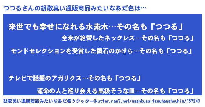 | 男性向けラノベタイトル風あだ名 | 『つつるに滅ぼされるだけの簡単なお仕事です』 |
