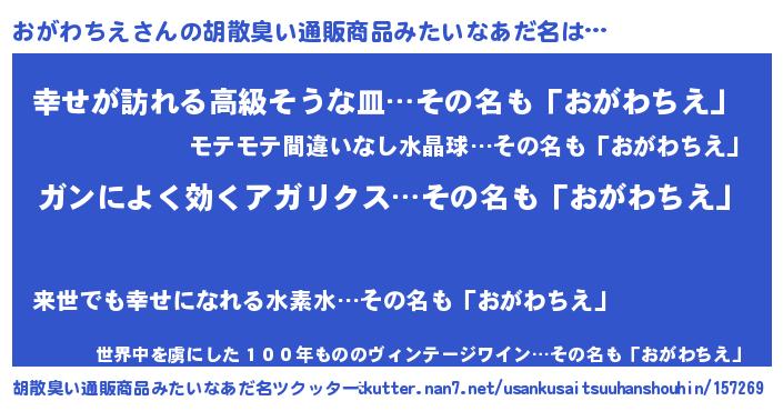 | 女子向けラノベタイトル風あだ名 | 『おがわちえなんてお断りですっ。』 |