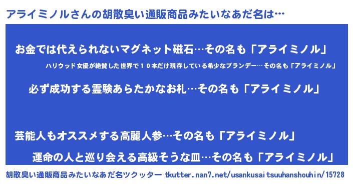 | 男性向けラノベタイトル風あだ名 | 『アライミノルの憂鬱』 |