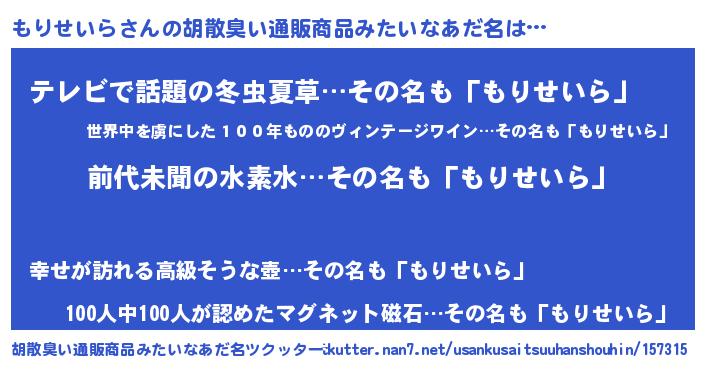 | 意味不明あだ名 | 『永久保存もりせいら』『自称もりせいら』 |