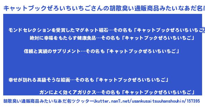 | 男性向けラノベタイトル風あだ名 | 『ダンジョンにキャットブックぜろいちいちごを求めるのは間違っているだろうか』 |