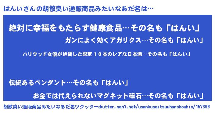 | 意味不明あだ名 | 『住所不定無職はんい(43歳)』『自称はんい』 |