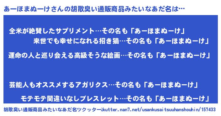| 男性向けラノベタイトル風あだ名 | 『うちのあーほまぬーけが世界を掌握している!』 |
