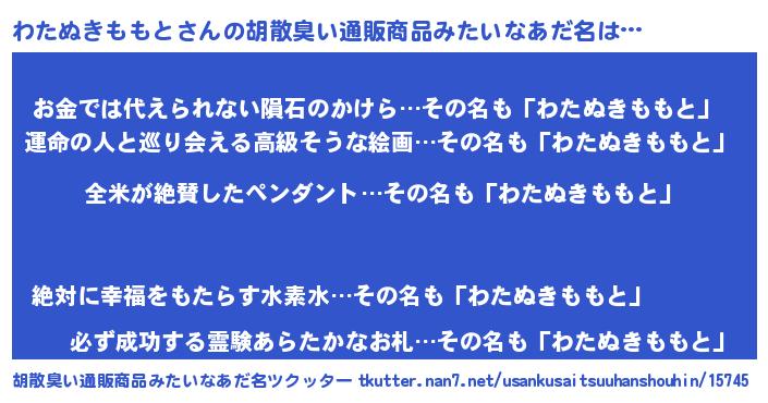 | 意味不明あだ名 | 『とにかく怪しいわたぬきももと』 |