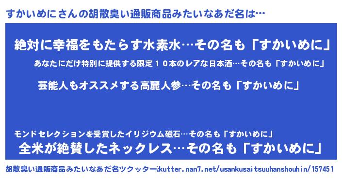 | ヘコむあだ名 | 『すかいめに(笑)』『すかっちょ』 |