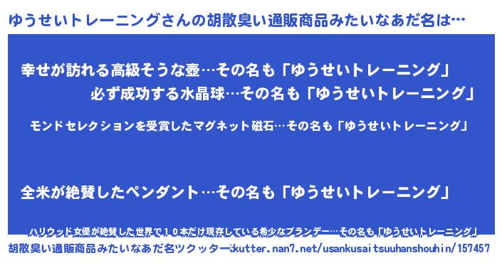 | 男性向けラノベタイトル風あだ名 | 『うちのゆうせいトレーニングが世界を掌握している!』 |
