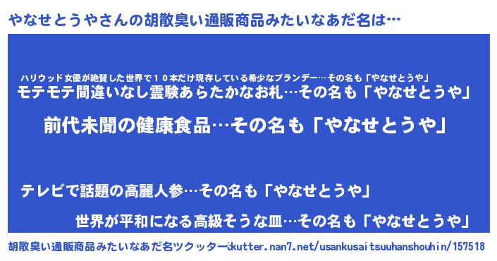 | ヘコむあだ名 | 『やなせとうや(笑)』『酢こんぶ』 |