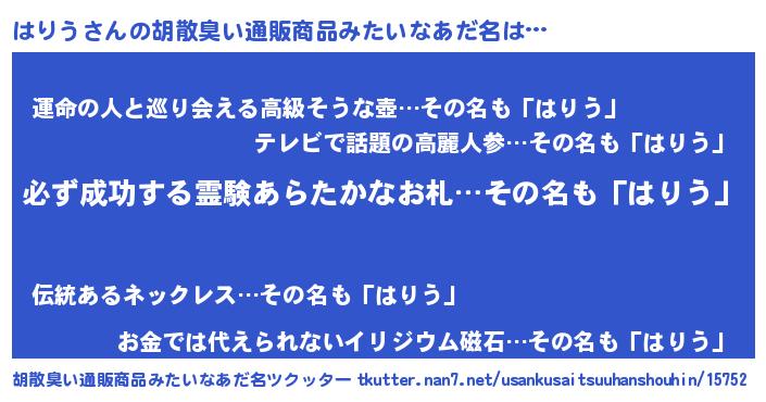 | 男性向けラノベタイトル風あだ名 | 『はりうの憂鬱』『魔法科高校のはりう』 |