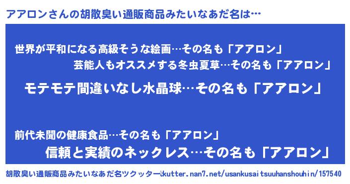 | 意味不明あだ名 | 『ペロリンアアロン』『自称アアロン』 |