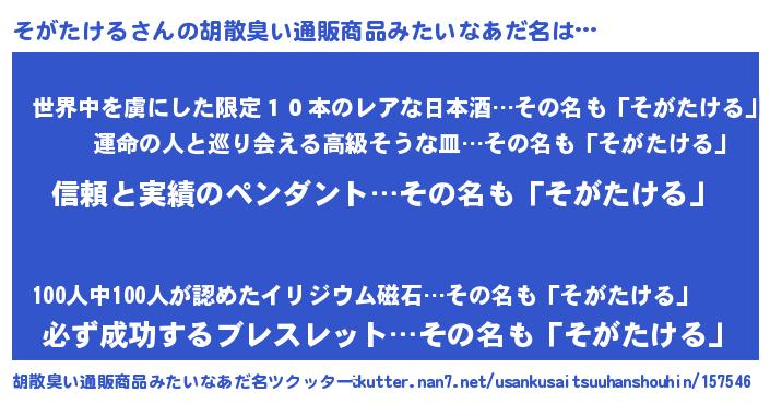 | 意味不明あだ名 | 『とにかく怪しいそがたける』 |
