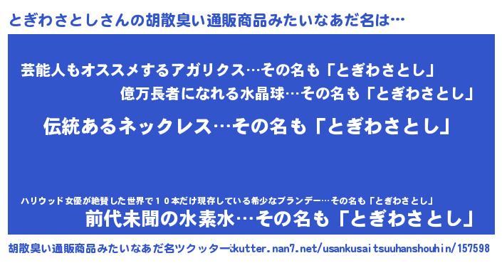 | ヒーロー風カッコイイあだ名 | 『魔戒騎士トギ』『究極戦士トギワサトシ』 |