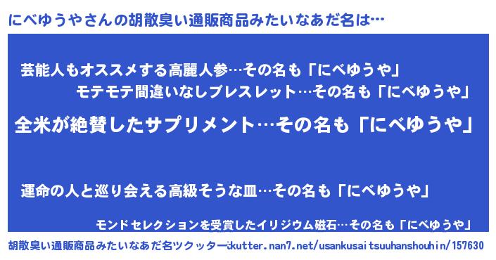 | 男性向けラノベタイトル風あだ名 | 『にべゆうやの嫁は女の子じゃないと思った?』 |