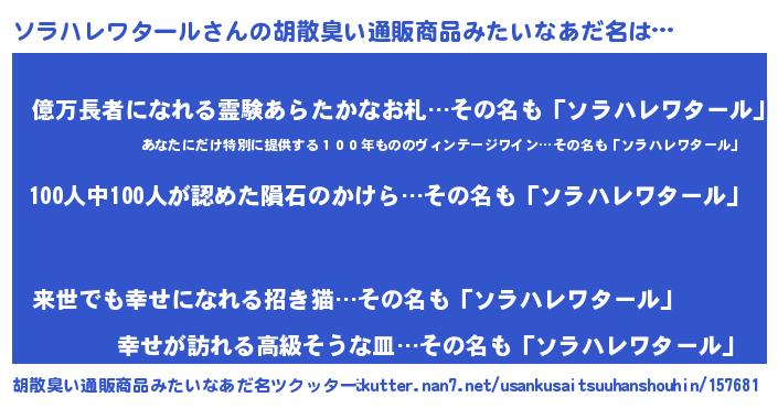 | 男性向けラノベタイトル風あだ名 | 『おまえをオタクにしてやるから、俺をソラハレワタールにしてくれ! 』 |