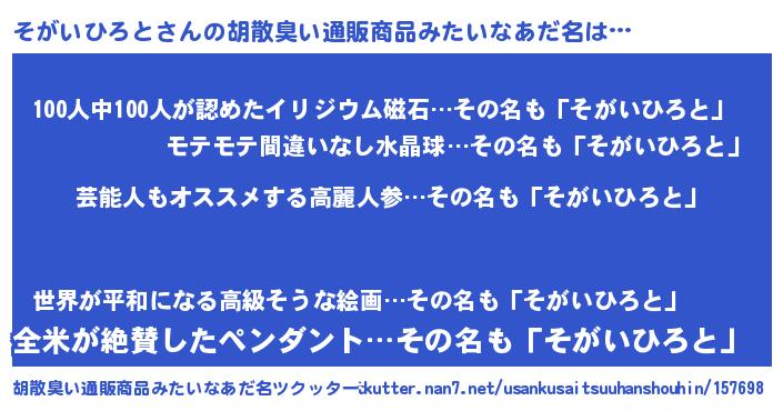| 男性向けラノベタイトル風あだ名 | 『Re:そがいひろとから始める異世界生活』 |