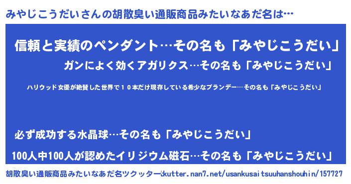 | 恥ずかしいあだ名 | 『ミヤリンリン』『ボンバーヘッドみや』 |