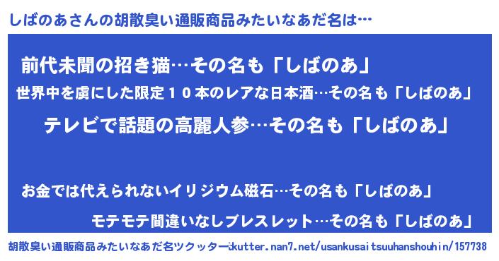 | 意味不明あだ名 | 『自称しばのあ』『永久保存しばのあ』 |