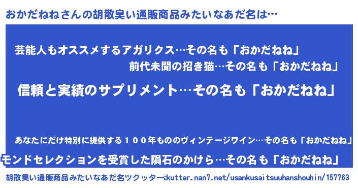 | 欧米人風あだ名 | 『アンジェラ・おかだねね』 |