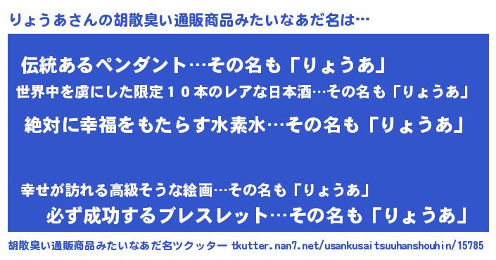 | 男性向けラノベタイトル風あだ名 | 『りょうあという概念が存在しない退屈な世界 』 |