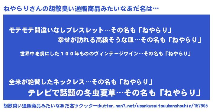 | 男性向けラノベタイトル風あだ名 | 『魔弾の王とねやらり』『ねやらりの憂鬱』 |