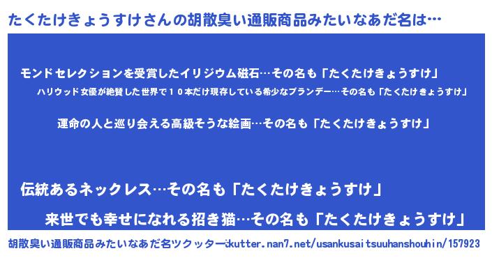 | 肩書あだ名 | 『たくたけきょうすけ総理大臣』 |