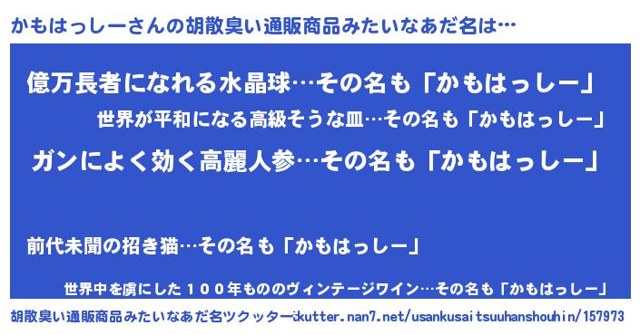| 欧米人風あだ名 | 『アンジェラ・かもはっしー』 |