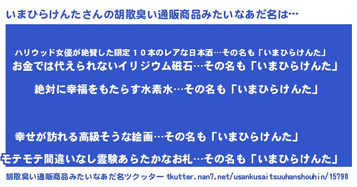 | ヘコむあだ名 | 『いまひらけんた(震え声)』『いまもー』 |