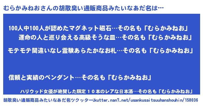 | 恥ずかしいあだ名 | 『プリティーむらかみねお』『むらっちょ』 |