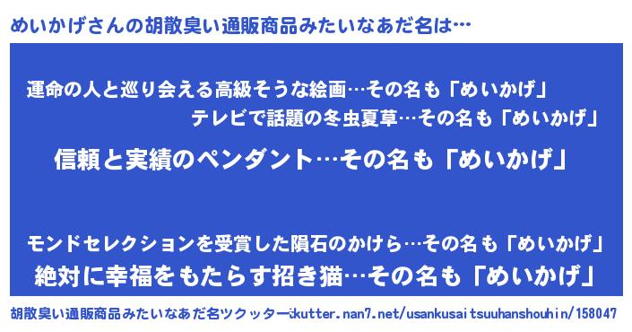 | 伝説のあだ名 | 『孤高の遊び人めいかげ』 |