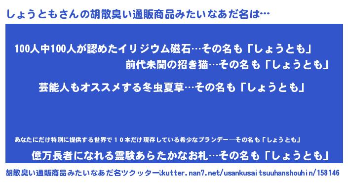 | 男性向けラノベタイトル風あだ名 | 『Re:しょうともから始める異世界生活』 |