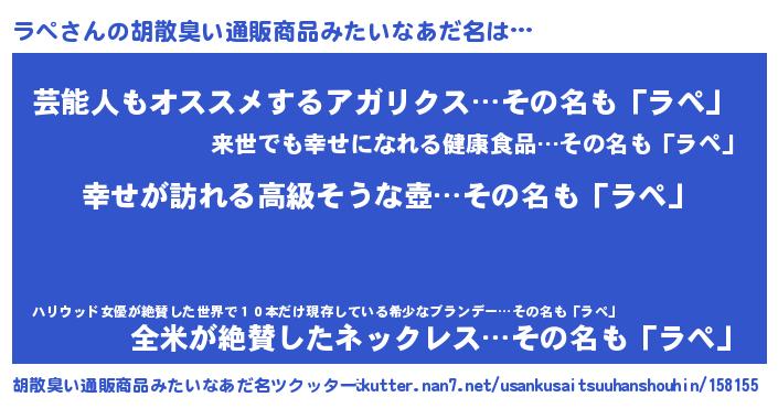| 男性向けラノベタイトル風あだ名 | 『緋弾のラペ』『転生したらラペだった件』 |