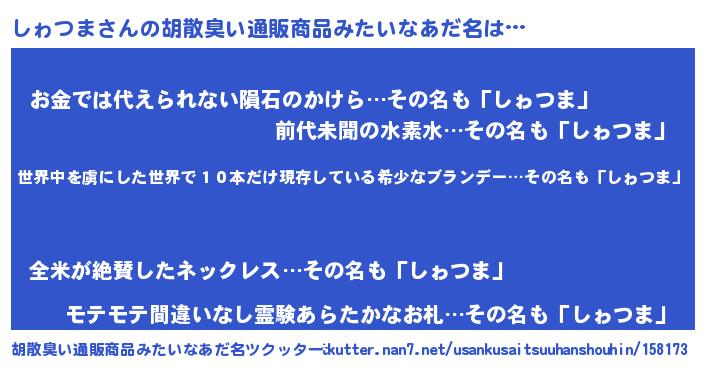 | 意味不明あだ名 | 『住所不定無職しゎつま(91歳)』 |