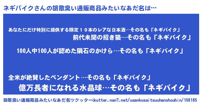 | 男性向けラノベタイトル風あだ名 | 『おまえをオタクにしてやるから、俺をネギバイクにしてくれ! 』 |