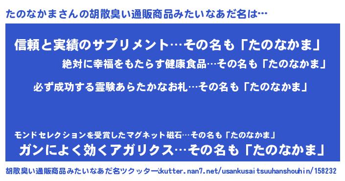 | 男性向けラノベタイトル風あだ名 | 『緋弾のタノナカマ』『たのなかまの憂鬱』 |