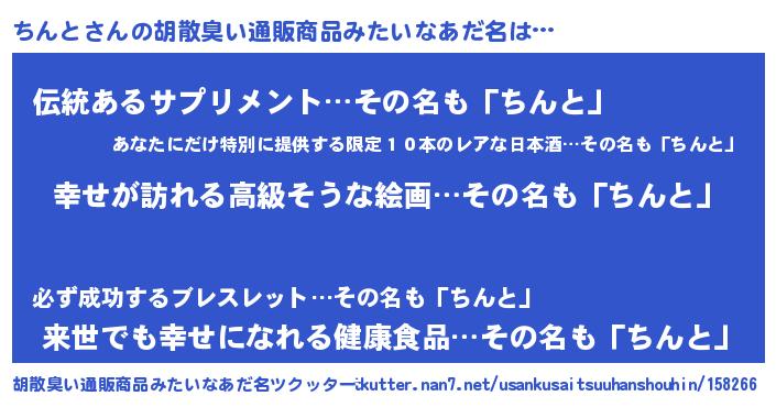 | 男性向けラノベタイトル風あだ名 | 『緋弾のチント』『魔弾の王とちんと』 |