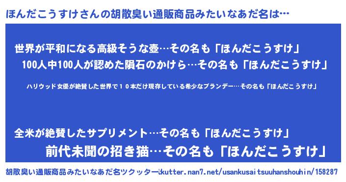 | 意味不明あだ名 | 『住所不定無職ほんだこうすけ(98歳)』 |