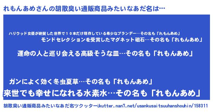 | 男性向けラノベタイトル風あだ名 | 『れもんあめ~年齢イコール彼女いない歴の魔法使い~』 |