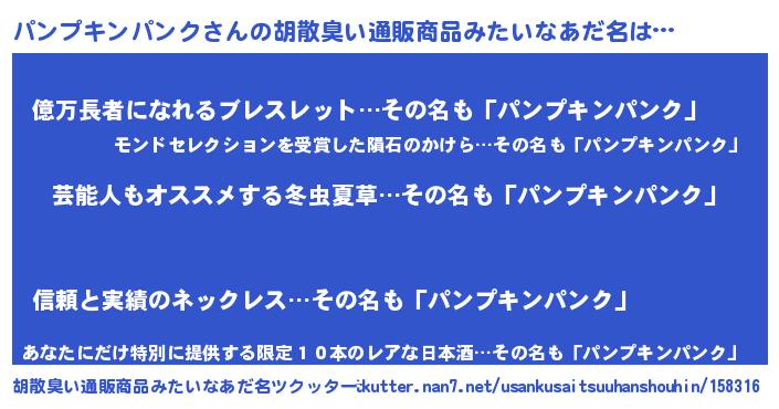 | 男性向けラノベタイトル風あだ名 | 『パンプキンパンクに滅ぼされるだけの簡単なお仕事です』 |
