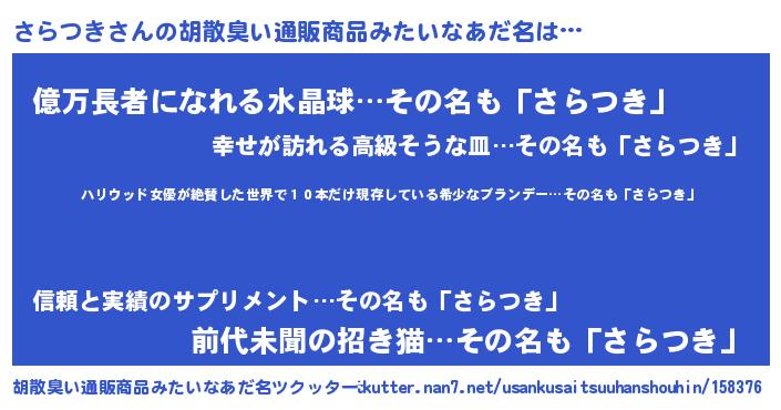 | 男性向けラノベタイトル風あだ名 | 『サラツキスレイヤー』『さらつきの憂鬱』 |