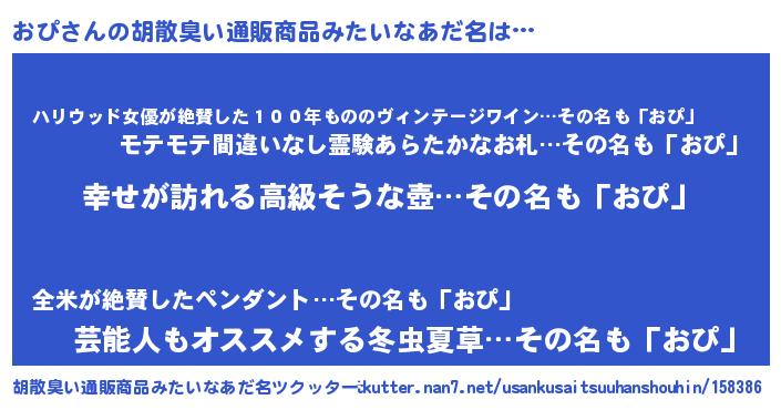 | 男性向けラノベタイトル風あだ名 | 『やはりおぴの青春ラブコメはまちがっている 』 |