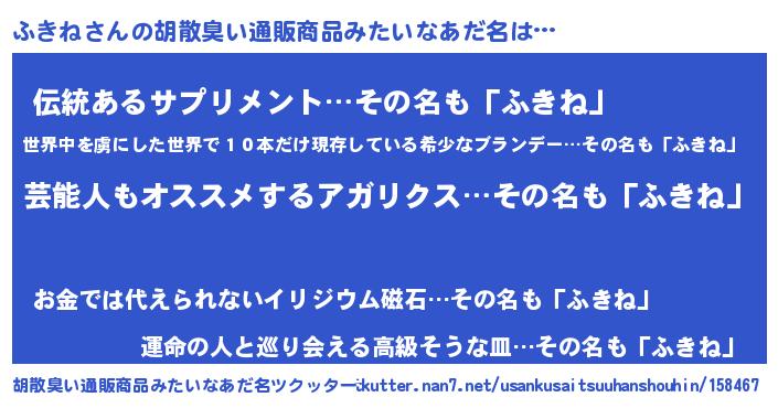 | 意味不明あだ名 | 『自称ふきね』『とにかく怪しいふきね』 |