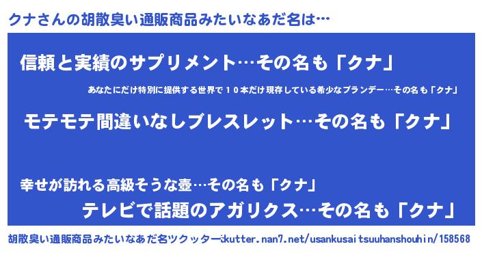 | 男性向けラノベタイトル風あだ名 | 『クナアートオンライン』『緋弾のクナ』 |
