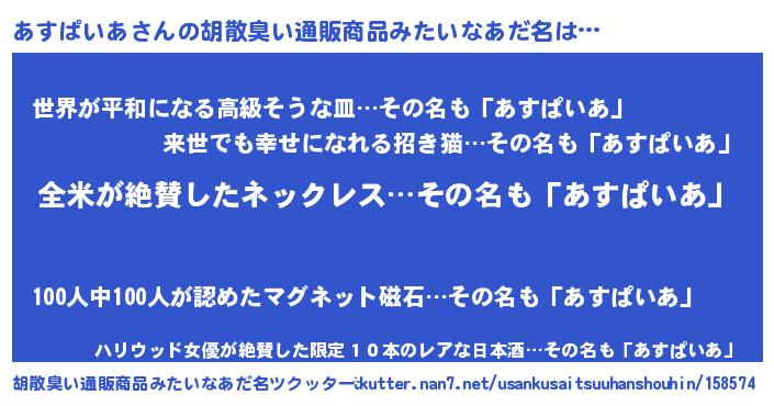 | 男性向けラノベタイトル風あだ名 | 『あすぱいあの嫁は女の子じゃないと思った?』 |