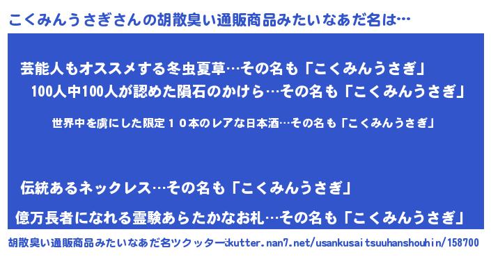 | 恥ずかしいあだ名 | 『コクミンウサギデラックス』『こくちん』 |