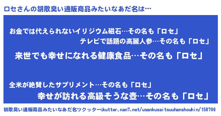 | 男性向けラノベタイトル風あだ名 | 『ロセという概念が存在しない退屈な世界 』 |