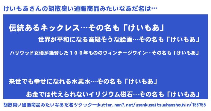 | 意味不明あだ名 | 『住所不定無職けいもあ(13歳)』 |
