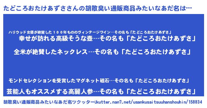| 男性向けラノベタイトル風あだ名 | 『たどころおたけあずさの嫁は女の子じゃないと思った?』 |