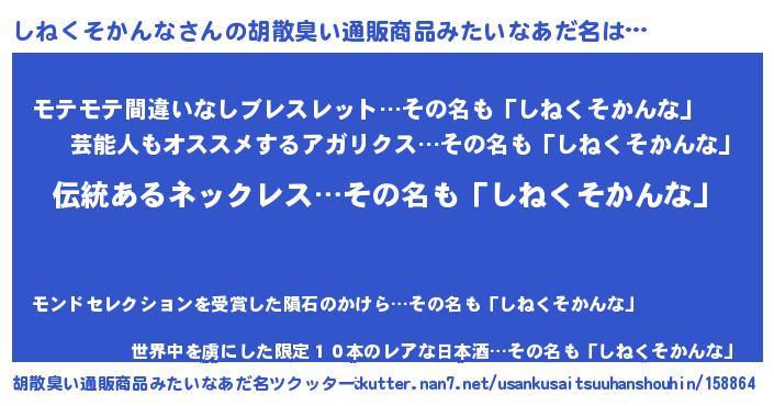 | 男性向けラノベタイトル風あだ名 | 『転生したらしねくそかんなだった件』 |