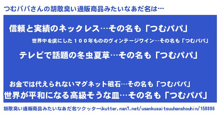 | 意味不明あだ名 | 『自称つむパパ』『めかぶ科つむパパ属』 |