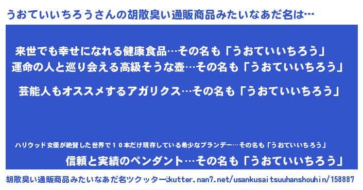 | 男性向けラノベタイトル風あだ名 | 『うおていいちろう~年齢イコール彼女いない歴の魔法使い~』 |