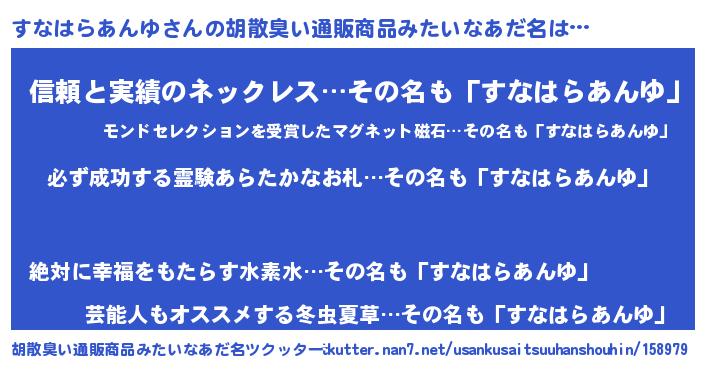 | 男性向けラノベタイトル風あだ名 | 『すなはらあんゆの憂鬱』 |